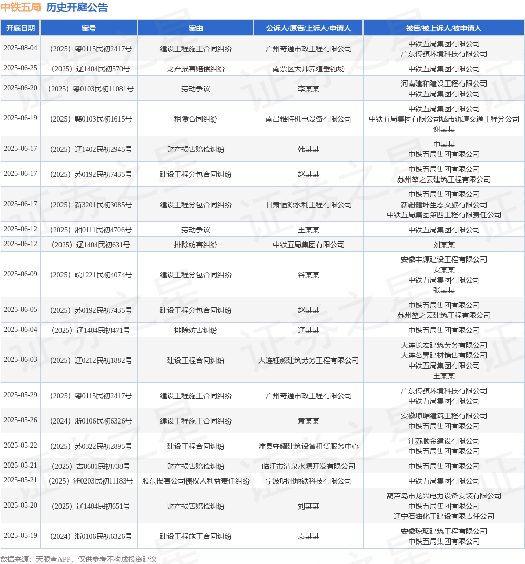 本站消息,根据天眼查APP显示,近日公布了一则中铁五局集团有限公司作为被告/被上诉人的开庭公告,详细内容如下: